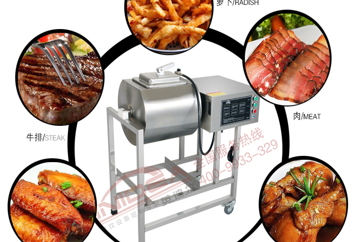 腌制机是用来腌制肉类产品的专用设备,是经过均匀搅拌让肉类产品在滚桶里相互磨擦而使调味料的味道均匀渗入肉制品内,从而达到快速腌制的目的,完全可替代人工腌制的工作。